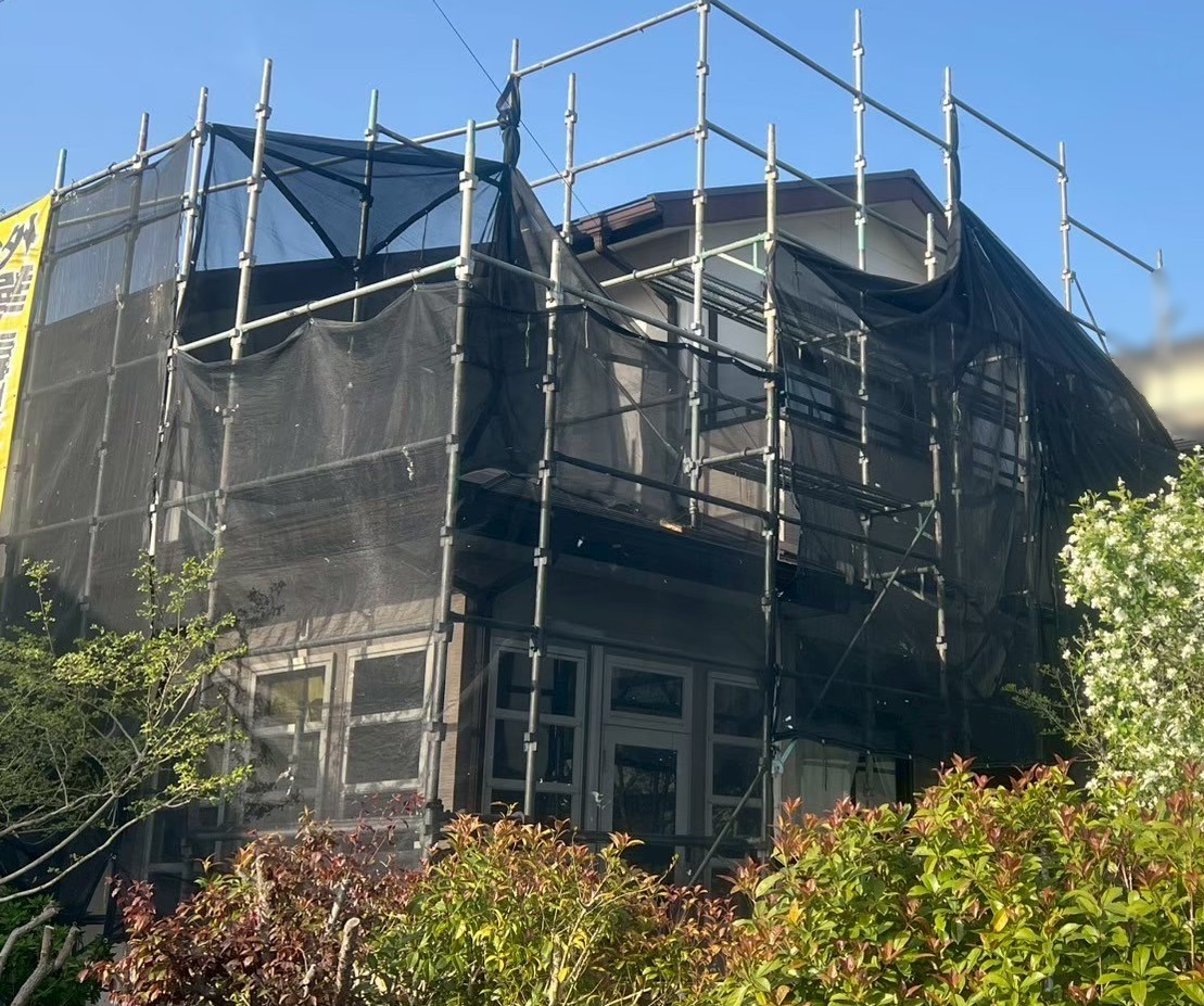 工事の際は、お家の周りに足場が設置され飛散防止のシートが張られます。