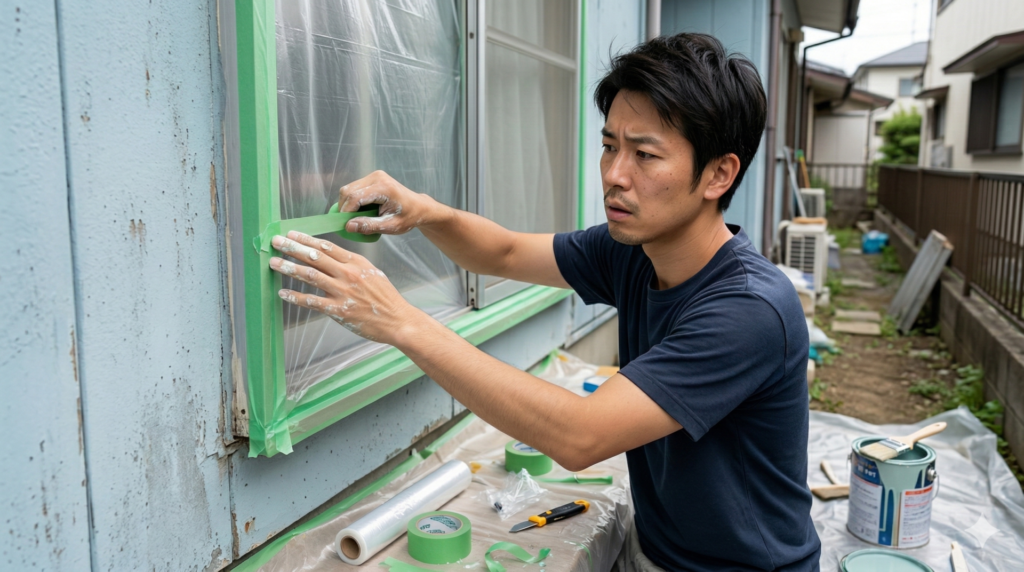 - 養生: 窓、ドア、エアコンの室外機、地面など、塗料が付いてはいけない場所を徹底的にビニールで覆います。