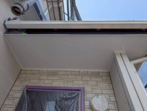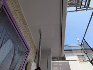 まずは軒天の下塗りから施工しました。下地の吸い込みを抑え、上塗り塗料の密着性を高めるための重要な工程です。軒天は湿気がこもりやすい部分でもあるため、丁寧な施工が必要になります。