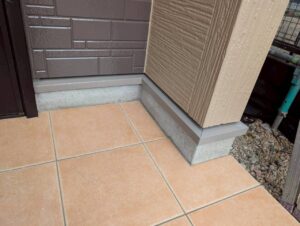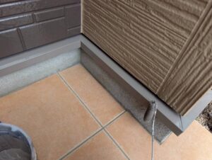 まずは水切りの塗装です。外壁と基礎の境目にある重要な部材で、雨水の侵入を防ぐ役割があります。鉄部のため錆が発生しやすく、今回も事前に錆止めを施工したうえで仕上げ塗装を行っています。