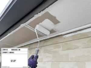 その後、軒天部分の塗装1回目を施工しました。今回使用しているのはエバーロック(N-87)で、明るく清潔感のある仕上がりになる予定です。軒天は湿気がこもりやすく、カビが発生しやすい箇所のため、適切な塗料選定と施工が重要です。