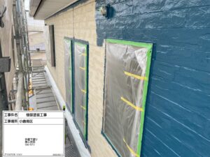 前日に引き続き、KFハイブリッドプライマーを使用し、塗り残しがないよう細部まで丁寧に施工を進めています。外壁塗装において下塗りは、上塗り材の性能を最大限に引き出すための非常に重要な工程です。
