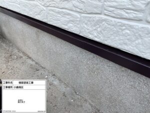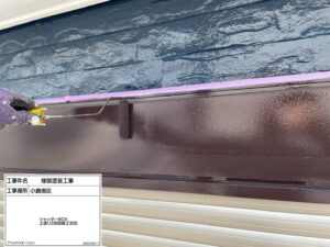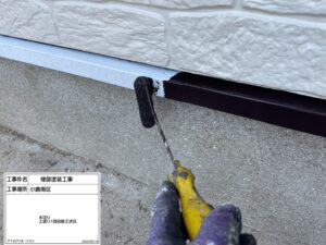 続いて水切り部分の塗装を実施。水切りは雨水の侵入を防ぐ重要な部材であり、外壁塗装と同様にしっかりと保護する必要があります。細かな部分ですが、見た目の印象にも大きく関わるため、ムラなく仕上げています。