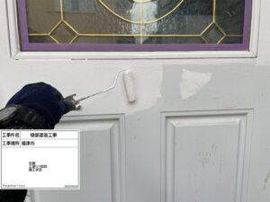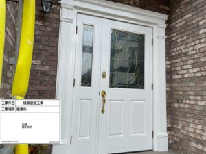 玄関ドアはユメロック(N95)で塗装を行い、ツヤのある高級感のある仕上がりになりました。出入りの際に目に入る部分だからこそ、細部まで丁寧に仕上げています。