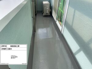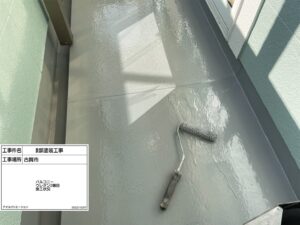ベランダ床は紫外線や雨水の影響を直接受けるため、防水層を守るトップコートの施工が非常に重要です。均一な塗膜を形成し、しっかりと仕上げています。