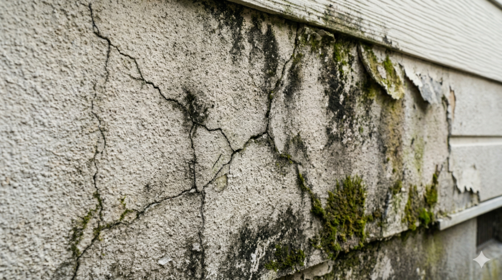 - 苔・カビの繁殖: 常に壁が湿っている証拠です。外壁材自体の強度が低下し、もろくなっています。